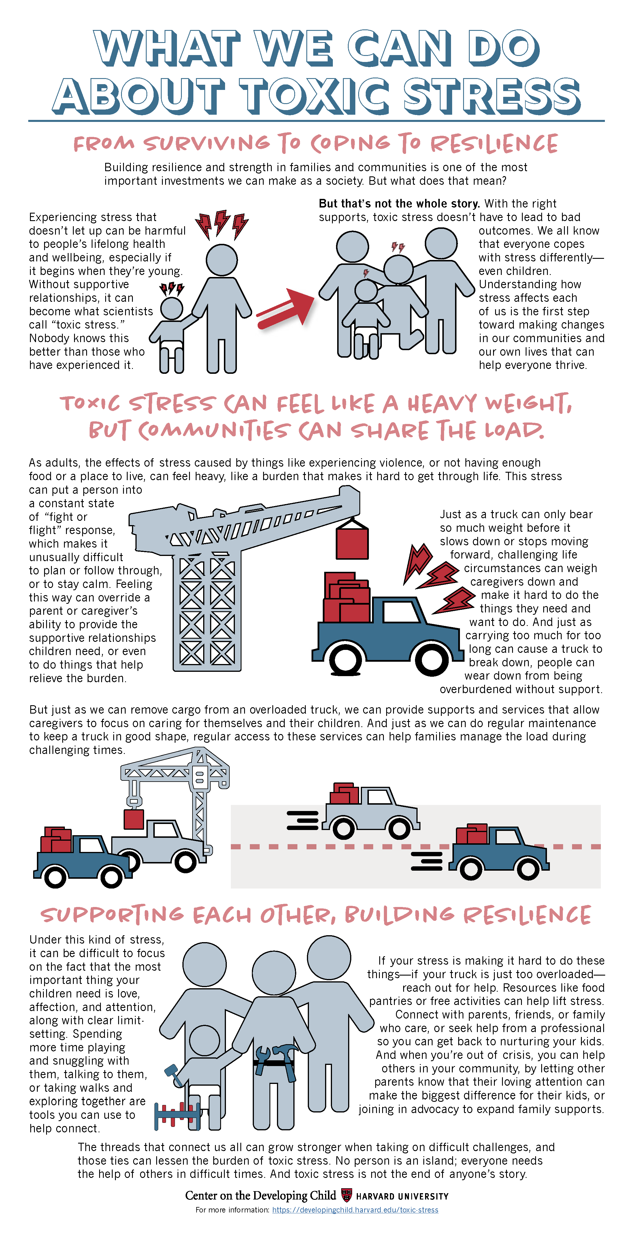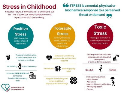 ACE are serious childhood traumas that can result in toxic stress, which may lead to long term health and behavioral problems.111 Stress can be categorized into three categories: (1) normal or “positive” stress, (2) tolerable stress, and (3) toxic stress.112 Normal stress is what people deal with day-to-day, such as being stressed for an exam. Tolerable stress is defined as adversity that can be managed with the help of supportive adults. Toxic stress, however, is the result of tolerable stress without a buffer of protection from a supportive adult.113 Children experiencing ACE are often experiencing toxic stress. The detrimental effects of ACE can be managed, however, if adults intervene and make the stress tolerable.